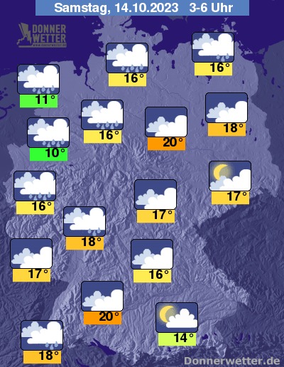 In der Nacht zum Samstag zieht eine Schauerfrot von Nordwest nach Südost über Deutschland hinweg, dabei bilden sich teils kräftige Schauer. Vor und nach der Schauerfront ist es auch teils aufgelockert bewölkt und lange Zeit trocken. Die Temperatur sinkt auf tropische 20 Grad in Magdeburg und etwa 10 Grad am Niederrhein. Es weht verbreitet ein oft starker und teils stürmischer Wind.