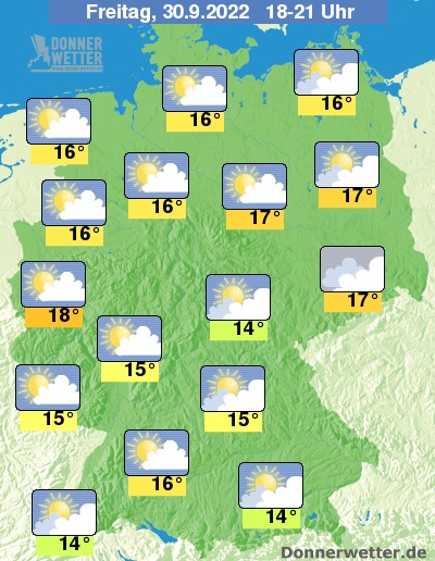 Heute Abend ist es im Land verbreitet heiter oder sogar sonnig. Mehr und zum Teil dichte Wolken halten sich über dem südlichen Bayern und über Sachsen, dabei bleibt es aber trocken. Die Temperatur liegt bei 14 Grad in München und 18 Grad in Köln.
