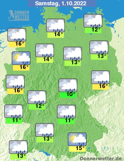 Am Samstag ziehen von Westen her überwiegend dichte Wolken durch und es fällt häufig Regen. Die Temperatur steigt auf 10 Grad in Jena und bis 16 Grad in Köln. Der Wind weht gebietsweise, an den Küsten verbreitet stürmisch.