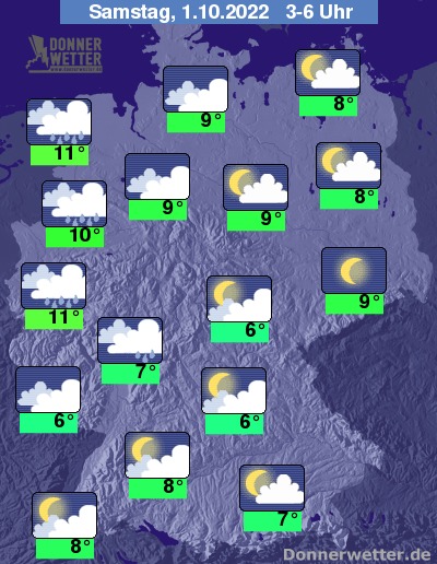 In der Nacht zum Samstag ist es zunächst noch verbreitet locker bewölkt oder auch sternenklar. Im Westen und Nordwesten ziehen jedoch bereits dichte Wolken heran, die etwa ab Mitternacht Regen bringen können. Bis zum Morgen erreicht die Regenfront etwa eine Linie vom südlichen Rheinland-Pfalz bis ins westliche Mecklenburg-Vorpommern. Die Temperatur sinkt auf 11 Grad in Bonn und bis 6 Grad in Nürnberg. Im Nordwesten und Norden weht ein oft stürmischer Wind. An der Nordsee herrscht verbreitet Sturm.