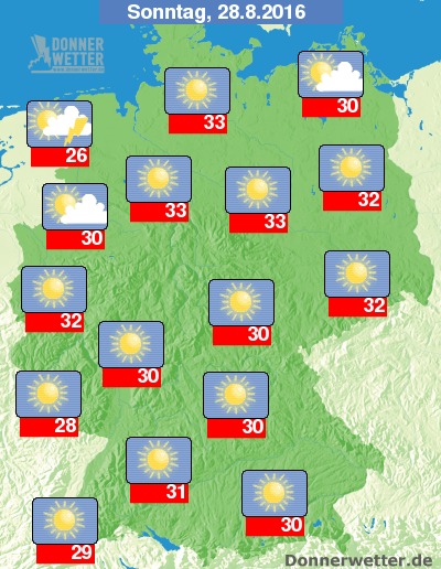 Heute scheint über der Bundesrepublik verbreitet die Sonne und es ziehen nur selten wenige Wolken durch, dabei bleibt es trocken. Über Schleswig-Holstein und im Umfeld von Nord- und Ostsee sind jedoch oft einige und zum Teil auch dichte Wolken möglich, dazu bilden sich hier und da auch Schauer oder lokale Gewitter. Die Temperatur steigt auf 26 Grad in Cuxhaven und bis etwa 33 Grad in Hannover.