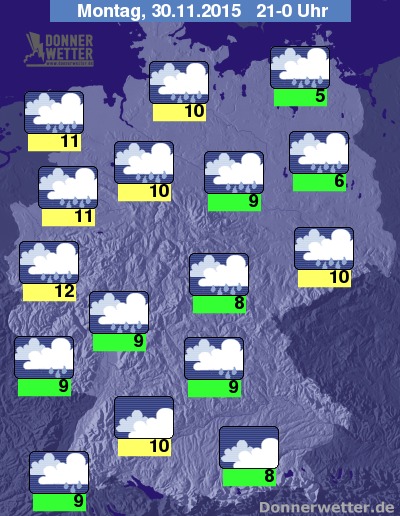 Heute Abend bleibt es landesweit bei eine dichten Bewölkung, dazu fällt verbreitet langanhaltender und zum Teil ergiebiger Regen. Die Abendtemperatur liegt bei milden 12 Grad in Düsseldorf und um 5 Grad in Neubrandenburg. Der Wind weht überwiegend stark bis stürmisch mit teils schweren Sturmböen, auf den Bergen und an den Küsten sind einzelne orkanartige Böen möglich.