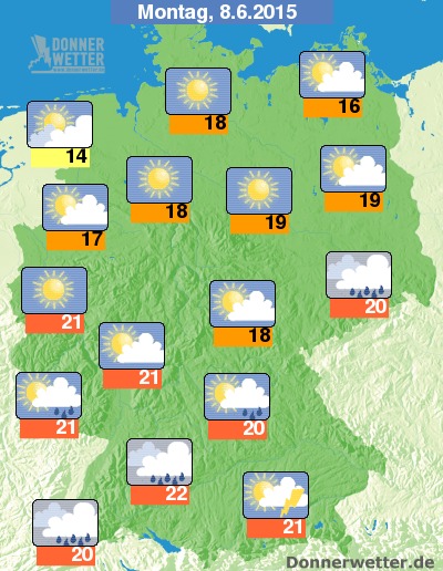 Ein wenig wärmer, dafür aber deutlich wechselhafter zeigt sich der Montag im Süden. Vor allem zwischen Schwarzwald und Oberfranken kann es im Tagesverlauf bei Werten um 20 bis 22 Grad C teils kräftig regnen.