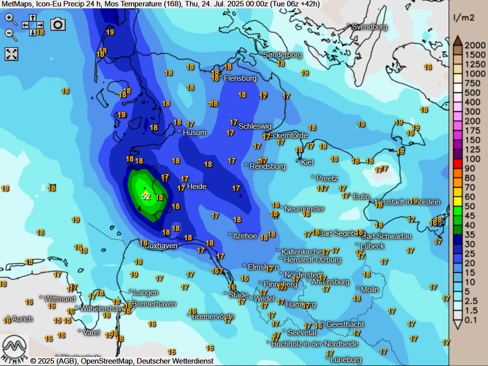 Die Karten bilden die akkumulierten 24-Stunden-Regenmengen am Mittwoch für die gesamte Bundesrepublik und im Detail Schleswig-Holstein ab.