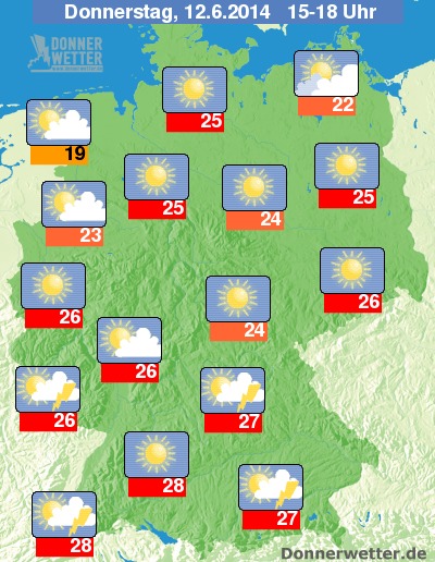 Weiter nach Norden bleibt es dagegen vielfach freundlich bei häufigem Sonnenschein und meist nur lockerer Bewölkung. Die Temperatur liegt bei sommertauglichen 19 bis 28 Grad.
