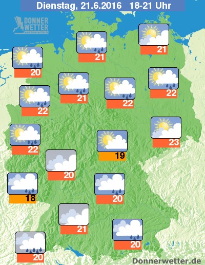 Zum Anstoß am Abend bleibt es vielerorts stark bewölkt, jedoch zeigen sich zwischendurch auch immer häufiger mal Auflockerungen. Es bilden sich gebietsweise Schauer bei Temperaturen von 18 Grad am Pfälzer Wald und um 23 Grad an der Neiße.