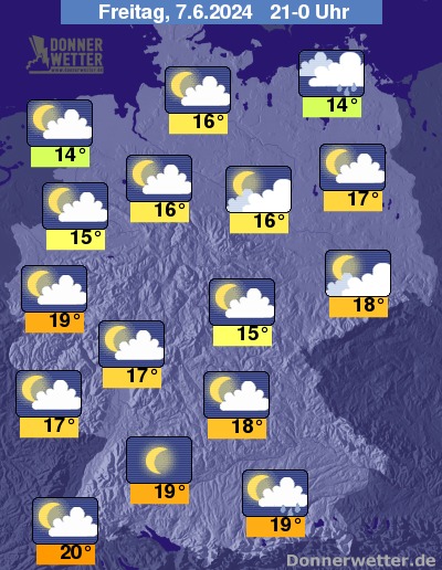 Am Freitagnachmittag ist der Himmel über dem norddeutschen Tiefland sowie südlich der Donau wechselnd oder stark bewölkt; dabei muss zeitweie mit Schauern, an den Alpen auch lokalen Gewittern gerechnet werden. In den übrigen Landesteilen ist es teils heiter bis wolkig, teils sonnig und es bleibt trocken.