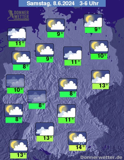 Die Temperaturen gehen in den Frühstunden zurück auf Werte um 14 Grad am Alpenrand und 8 Grad im Rhein-Main-Gebiet.