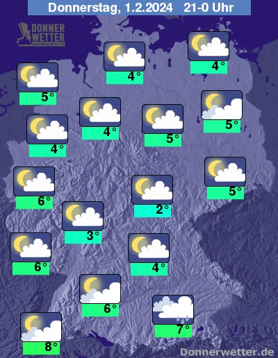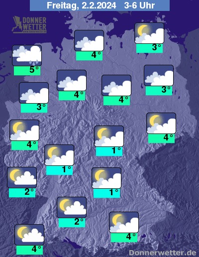 In der ersten Nachthälfte kann am Alpenrand noch etwas Regen fallen, sonst bleibt es bei lockerer oder aufgelockerter Bewölkung zunächst noch trocken. Im weiteren Nachtverlauf zieht dann im Norden und Nordwesten neuer Regen auf, der in den frühen Morgenstunden auch die nördlichen und zentralen Mittelgebirge erreicht, Schneefallgrenze bei etwa 500 m.
