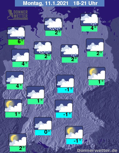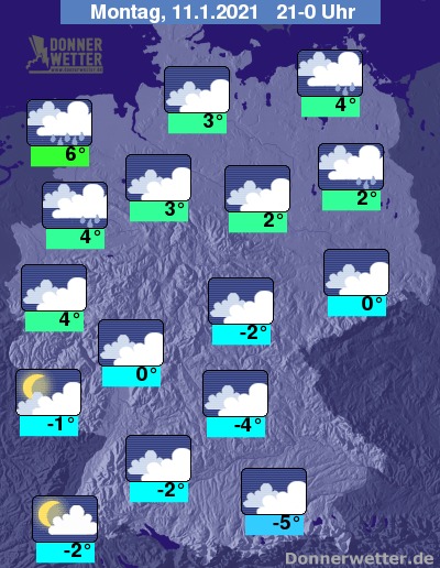 Die Temperaturen gehen bis Mitternacht auf Werte um -5 Grad am Alpenrand und um 6 Grad in Ostfriesland zurück.