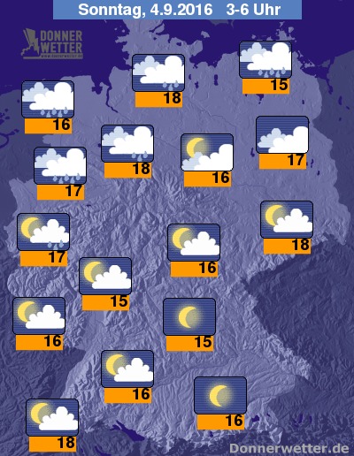 In der kommenden Nacht bleibt der Himmel nach Südosten hin noch meist leicht bewölkt oder sternenklar. Im Nordwesten fällt bereits zu Beginn aus dichten Wolken immer wieder, teils auch langanhaltender Regen. Im Laufe der Nacht und bis zum Morgen breiten sich die Regenwolken bis etwa über die Nordwesthälfte Deutschlands hin aus, weiter nach Südosten bleibt es hingegen trocken. Die Temperatur sinkt auf 18 Grad in Hannover und bis 15 Grad in Oberfranken.