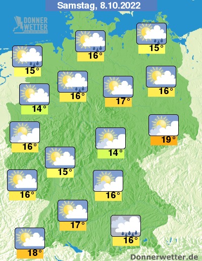 Am Samstag ist es im Alpenvorland und im Norden oft stark, teils aufgelockert bewölkt, dabei bilden sich einzelne Schauer. Im übrigen Land ist es zumeist heiter bis aufgelockert bewölkt und dazu auch trocken. Die Temperatur erreicht 14 Grad in Münster und bis 19 Grad in Dresden. An den Küsten weht zudem ein oft stürmischer Wind.