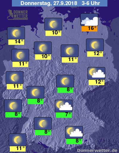Die zweite Nachthälfte gestaltet sich oft sternenklar oder nur leicht bewölkt. Lediglich an der Ostsee bleiben die Wolken in der Überzahl. Stellenweise können sich Nebelfelder bilden. Bis zu den Frühstunden kühlt die Luft auf 7 bis 12 Grad ab, milder bleibt es nur an den Küsten, sowie unter den dichteren Wolken ganz im Nordosten. Lediglich in geschützten Mittelgebirgs- und Alpentälern muss noch mit leichtem Bodenfrost gerechnet werden.