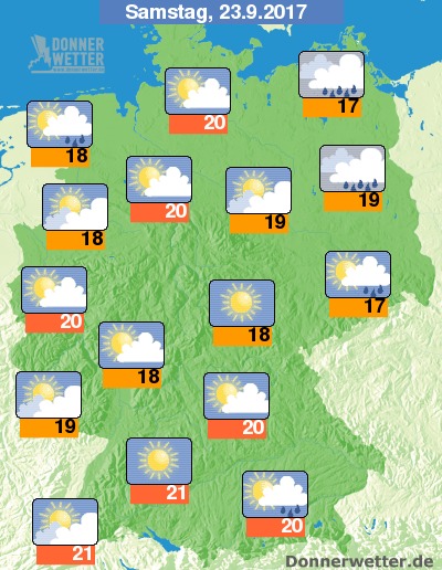 Am Samstag drückt ein Tiefausläufer von Osten her nach Sachsen und Berlin-Brandenburg herein und bringt bei dichten Wolken auch zeitweise Regen. Vereinzelte Schauer sind am Alpenrand sowie über dem Emsland möglich, sonst herrscht jedoch verbreitet heiteres, teils sonniges und dabei trockenes Wetter. Die Temperatur steigt auf 17 Grad in Stralsund und bis etwa 21 Grad im Oberrheingraben.