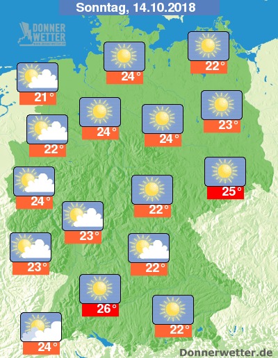 Am Sonntag scheint nach Auflösung einzelner Nebelfelder wieder häufig die Sonne und es ziehen meist nur sehr wenige oder garkeine Wolkken durch. Westlich des Rheins werden allerdings gebietsweise einige Wolken erwartet, dabei bleibt es aber noch trocken. Die Temperatur steigt auf spätsommerliche 21 bis 26 Grad.