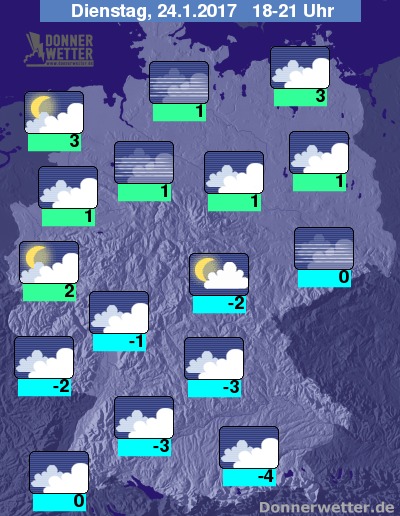 Heute Abend ist der Himmel meist wolkenverhangen, gebietsweise hält sich Nebel oder Hochnebel. Hier und da lockert die Bewölkung etwas auf. Es bleibt bundesweit trocken bei Werten zwischen -4 und 3 Grad.