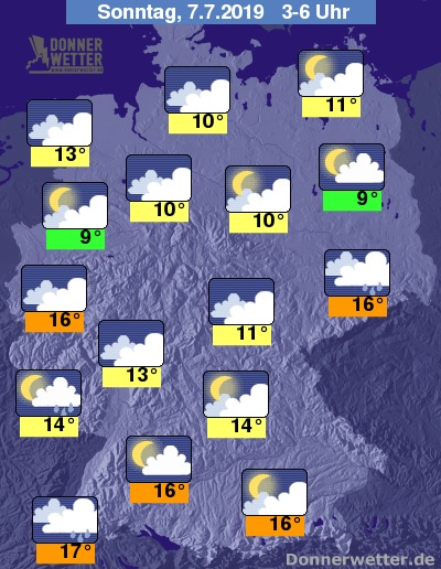 In der kommenden Nacht ist es zum Großteil stark, gebietsweise aber auch locker bis aufgelockert bewölkt. Im Alpenvorland können sich einzelne Schauer und Gewitter bilden, sonst fällt nur selten mal etwas Regen. Die Temperatur sinkt auf 17 Grad im Breisgau und bis 9 Grad im Münsterland.