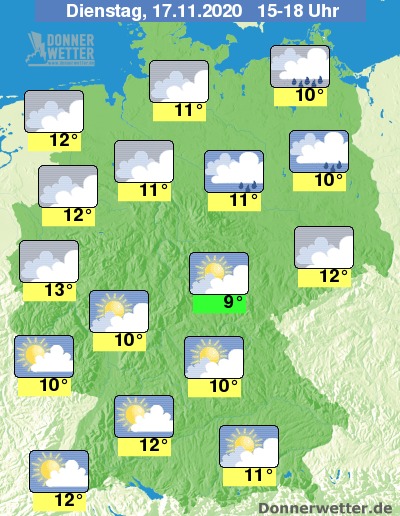 Am frühen Nachmittag zieht Warmfrontregen in den Nordosten. Sonst halten sich im Norden unseres Landes oft dichte Schichtwolken mit vereinzeltem Sprühregen. In der Südhälfte lässt sich zwischen den Wolken auch gelegentlich die Sonne blicken. Lokal können sich aber auch zähe Nebelfelder halten.