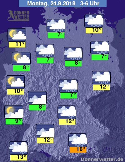 In der Nacht zum Montag bleibt es zunächst weitgehend dicht bewölkt und im Süden bilden sich gebietsweise Schauer und örtliche Gewitter, weiter nach Norden hin fällt häufig, zum Teil starker und gewittriger Regen. Im Laufe der zweiten Nachthälfte lockert es von Westen her auf und die Niederschläge klingen ab. Über der Osthälfte fällt jedoch bis zum Morgen hin weiterhin zeitweise Regen. Die Temperatur sinkt auf 16 Grad in München und bis 7 Grad in der Norddeutschen Tiefebene. Der Wind weht in weiten Landesteilen stark bis stürmisch, an der Nordsee herrscht teils Sturm.