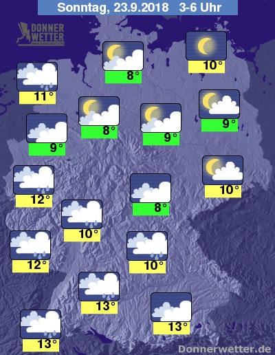 In der kommenden Nacht ist es über der Südwesthälfte meist stark bewölkt, aber zunächst trocken. Über dem Norden und Osten ist es zunächst nur locker bewölkt, gegen Morgen nimmt hier die Bewölkung zu, dazu bleibt es hier trocken. Über der Südwesthälfte setzt jedoch im Laufe der zweiten Nachthälfte Regen ein. Die Temperatur sinkt auf 13 Grad im Breisgau und bis 8 Grad im Thüringer Becken. An der Ostsee weht weiterhin ein teils stürmischer Wind.