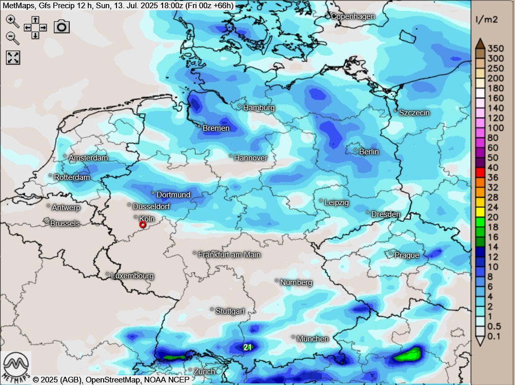 Am Sonntag zeigt sich der Himmel über dem äußersten Süden und Südwesten heiter bis wolkig und es bleibt meist trocken. In den übrigen Landesteilen überwiegt wechselnde oder starke Bewölkung, dabei fällt zeitweise teils schauerartig verstärkter Regen. Auch lokale Gewitter sind heute möglich.