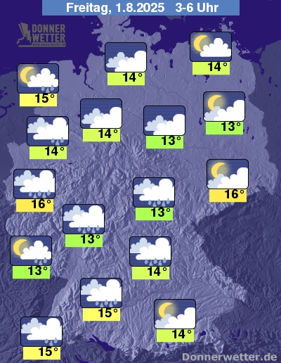 In der Nacht zum Freitag ziehen über der gesamten Südwesthälfte bis in den Osten rein kompakte Wolken durch, dabei fällt häufiger, teils schauerartiger Regen. Im Norden und Nordosten bleibt es weitgehend trocken. Die Temperatur sinkt auf 16 Grad in Dresden und bis 13 Grad in Saarbrücken.