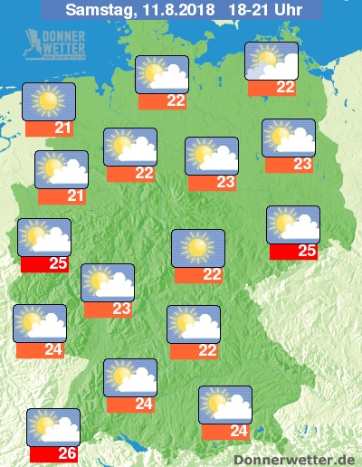Heute Abend bilden sich am Erzgebirge und im Umfeld von Nord- und Ostsee noch einzelne Schauer und vereinzelt auch Gewitter, sonst herrscht aber verbreitet heiteres und trockenes Wetter. Die Temperatur liegt bei 21 Grad in Cuxhaven und bis 26 Grad in Freiburg.