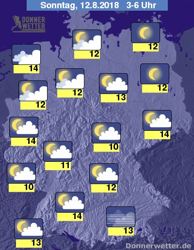 In der Nacht zum Sonntag ist der Himmel überwiegend nur locker bewölkt oder sternenklar, im Nordwesten sind jedoch auch hier und da einige, teils dichte Wolken möglich. Es bleibt überall trocken bei Tiefstwerten zwischen 14 Grad an der Nordsee und 10 Grad im Eichsfeld.