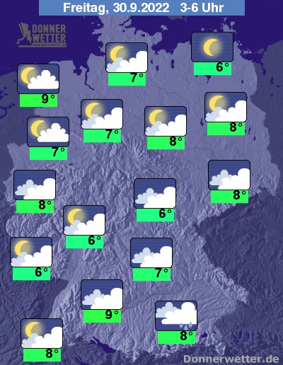In der Nacht zum Freitag bleibt es über dem Süden Deutschlands überwiegend bedeckt, im Alpenvorland fällt dazu zeitweise Regen, während es sonst meist trocken bleibt. Weiter nach Norden hin ist es aufgelockert oder stark bewölkt, vor allem im Nordwesten und Nordosten ist der Himmel oft locker bewölkt bis sternenklar, dazu bleibt es trocken. Die Temperatur sinkt auf 9 Grad in Cuxhaven und 6 Grad in Erfurt.