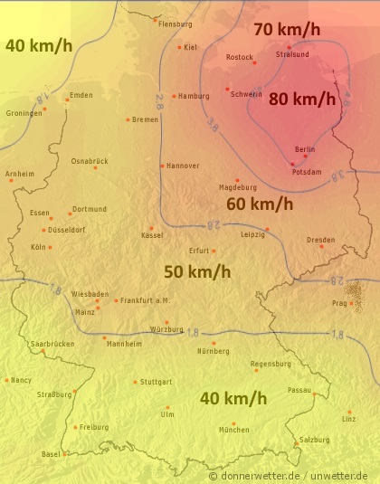 Unsere Karte zeigt die zu erwartenden Spitzenwindgeschwindigkeiten in Deutschland am Freitag: