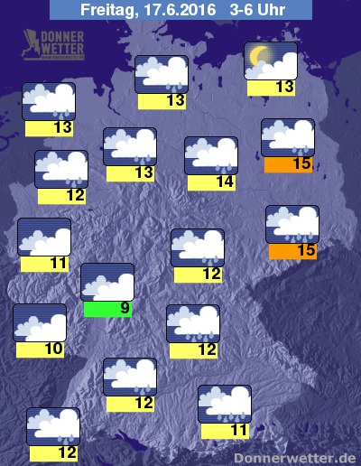 In der kommenden Nacht halten sich über weiten Teilen Deutschlands dichte Wolken aus denen vor allem über der Südosthälfte, jedoch auch über der Landesmitte und dem Norden zeitweise und zum Teil auch längeranhaltender Regen fällt. Meist trocken und hier und da auch etwas aufgelockert bewölkt ist es im Nordosten und Westen der Republik. Die Temperatur sinkt auf 15 Grad in Görlitz und bis 9 Grad am Westerwald.