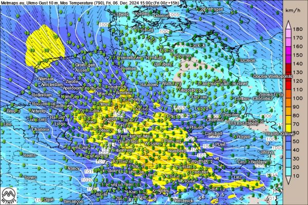 Die Karte zeigt die nach UKMO berechneten Spitzenwindböen für heute, 15 Uhr: