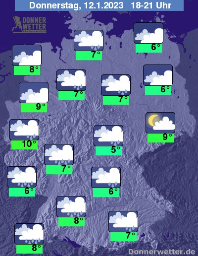 Heute Abend ist es im äußeren Osten noch teils locker bewölkt und dazu trocken. Im übrigen Bundesgebiet ziehen dichte Wolken durch und es fällt zum Teil langanhaltend Regen. Die Temperatur liegt bei 5 Grad in Jena und 10 Grad in Bonn. An der See weht ein teils stürmischer Wind.