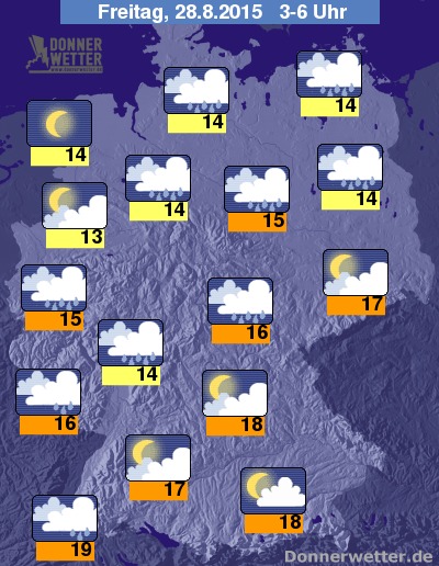 In der kommenden Nacht fällt in einem sehr breiten Streifen vom Südwesten des Landes bis in den Nordosten und nach Ostdeutschland hinein zeitweise und oft auch langanhaltender und teilweise ergiebiger Regen. Im Nordwesten klart der Himmel hingegen schon wieder auf und es bleibt hier trocken. Trocken und zum Teil aufgelockert bewölkt bleibt es bis zum Morgen auch weitgehend in Süddeutschland, sowie im südlichen Sachsen. Die Temperatur sinkt auf milde 19 Grad im Breisgau und auf etwa 13 Grad am Niederrhein.