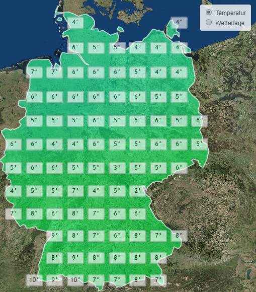 Die Tiefsttemperaturen liegen dazu verbreitet bei Werten um die 5 Grad, deutlich milder bleibt es nur im Süden, und insbesondere im Südwesten, bei bis zu 10 Grad.