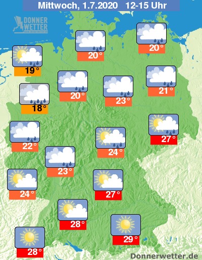Die Temperaturen bewegen sich im Westen und Norden meist zwischen 18 und 23 Grad, im Süden werden zum Teil sehr warme und schwüle 24 bis 30 Grad erreicht.