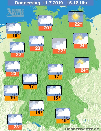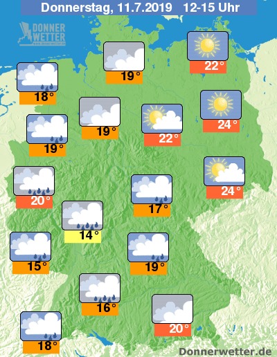 Die Temperaturen bewegen sich meist bei Werten zwischen 14 und 20 Grad unter den dichten Regenwolken, sowie angenehm warmen 20 bis 24 Grad in den Gebieten nordöstlich der Elbe.