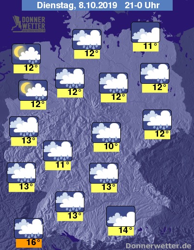 Während der zweiten Nachthälfte verlagert sich die Regenzone in den Süden. Auch an den Alpen wird es dann häufiger nass. Sonst trocknet die Luft ab und die Wolkendecke reißt auf, so dass gelegentlich Halbmond und Sterne zum Vorschein kommen können.