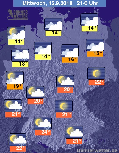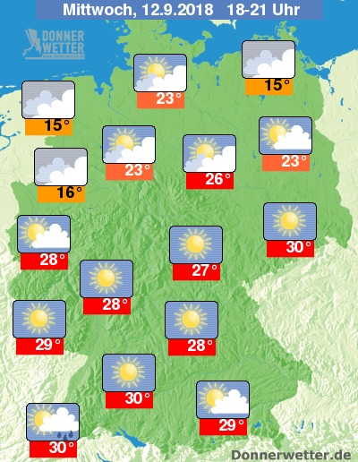 Am Abend bekommt die Wolkendecke über Norddeutschland größere Lücken und es bleibt meistens trocken. Sonst spendet die allmählich untergehende Abendsonne immer noch reichlich Wärme. Im südlichen Schwarzwald können sich örtliche teils gewittrige Regengüsse zusammen brauen. Die Temperaturen liegen gegen 18.00 Uhr in den mittleren und südlichen Landesteilen bei noch sehr warmen bis heißen 27 bis 30 Grad. Unter den teilweise immer noch dichten Wolken im Nordwesten und Norden werden nur 15 bis 20 Grad gemessen.