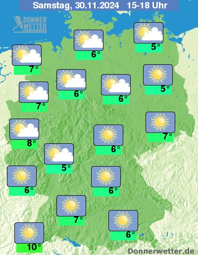 Am Samstagnachmittag ist der Himmel über dem Norden und Nordwesten heiter bis wolkig, es bleibt aber meist niederschlagsfrei. In den übrigen Landesteilen ist es nach Nebelauflösung verbreitet sonnig. Vor allem in den Flussniederungen teils anhaltend nebelig-trüb oder hochnebelartig bewölkt.
