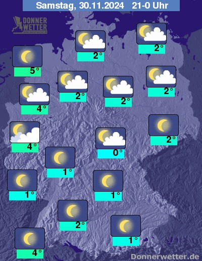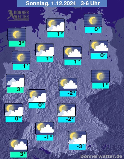 In der Nacht zum Sonntag ist es gering bewölkt oder sternenklar, in den frühen Morgenstunden kann sich verbreitet Nebel oder Hochnebel bilden. Es bleibt trocken.