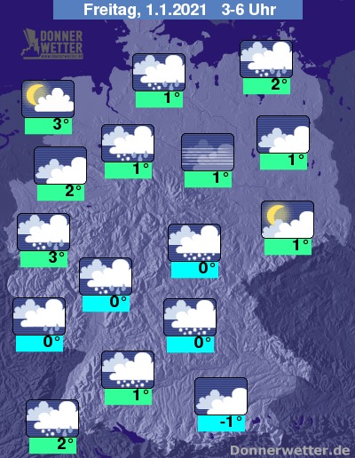 Der Neujahrstag startet vielerorts mit einer geschlossenen Wolkendecke, einzelne Auflockerungen beschränken sich am Morgen auf den Nordwesten des Landes. Verbreitet muss in den Frühstunden mit Schauern gerechnet werden, die auch bis in tiefe Lagen als Schnee fallen können.