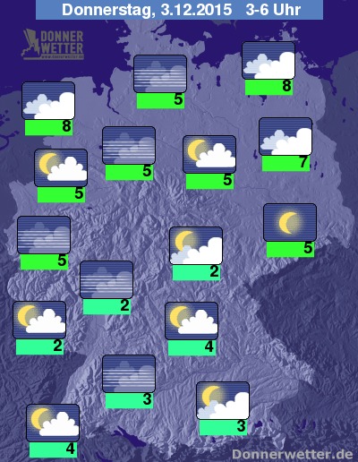 In der Nacht zum Donnerstag bleibt es vor allem in den küstennahen Regionen und im äußeren Osten des Landes meist stark bewölkt, jedoch trocken. Im übrigen Deutschland zeigt sich der Himmel dagegen überwiegend sternenklar und sonst locker bewölkt, dabei bleibt es natürlich trocken. Die Temperatur sinkt auf 8 Grad in Rostock und bis 2 Grad am Pfälzer Wald. Gebietsweise bildet sich Nebel oder Hochnebel, dabei ist vor allem im Süden und Südwesten stellenweise Glätte durch überfrierende Nässe möglich!