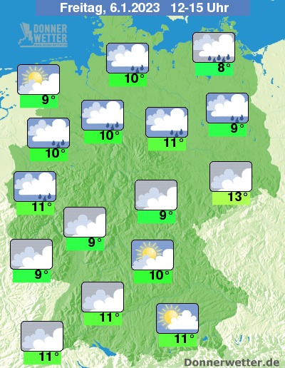 Heute Abend lockert die Bewölkung hier und da, vor allem im Norden etwas auf. Es bleibt weitgehend trocken bei Werten von 9 Grad in Neubrandenburg und 12 Grad in Bonn.