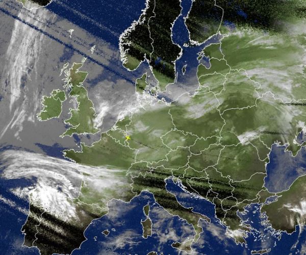 Auf dem Satellitenfoto von heute Morgen zeigen sich weite Teile von Europa bei meist lockerer bis aufgelockerter Bewölkung und unter leichtem Hochdruckeinfluss trocken. Ein Tief westlich der Iberischen Halbinsel sorgt mit seinen Ausläufern jedoch für verbreitet kräftige Schauer, besonders über Portugal und in den westlichen Landesteilen Spaniens.