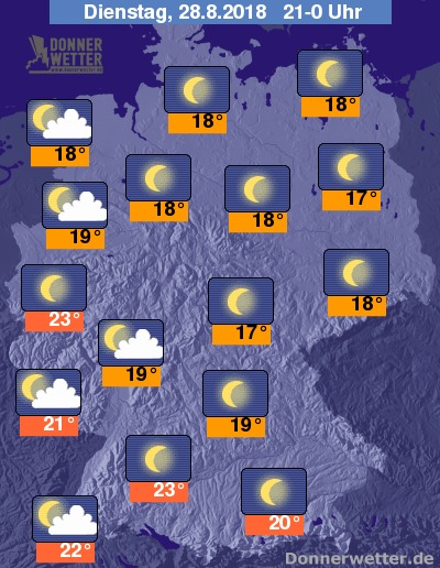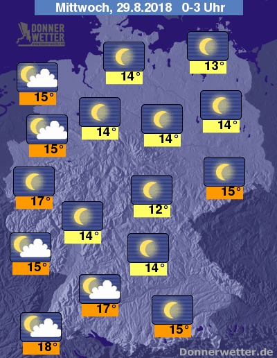 In der zweiten Nachthälfe gehen die Temperaturen auf Werte zwischen 12 Grad in den Mittelgebirgen und 18 Grad im Breisgau zurück. Dazu bleibt es sternenklar und nur im Westen leicht bewölkt.