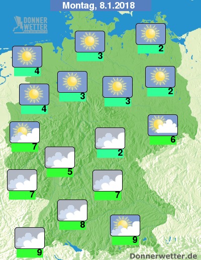 Zum Wochenstart zeigt sich der Norden verbreitet sonnig, aber auch in den übrigen Landesteilen kann sich die Sonne hier und da zeigen, jedoch bleibt es oft stark bewölkt, dabei allerdings überall trocken. Die Temperatur erreicht 2 bis 9 Grad.