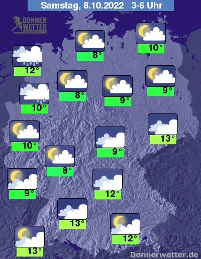 In der kommenden Nacht zieht im Nordwesten eine Kaltfront mit dichten Wolken und Schauern durch, sonst bleibt es meist locker bis aufgelockert, im Süden und über Sachsen eher stark bewölkt, jedoch trocken. Die Temperatur sinkt auf 13 Grad in Stuttgart und 8 Grad in Hannover.