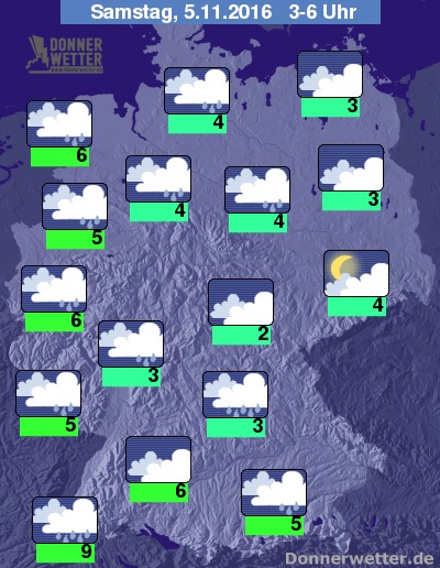 In der folgenden Nacht zieht sich der Himmel über der gesamten Bundesrepublik zu. Dazu bleibt es vor allem über dem Nordosten, Osten und dem Südosten noch trocken, bevor auch hier, wie bereits zuvor schon in den westlicheren Landesteilen Regen aufzieht. Die Temperatur sinkt auf nasskalte 9 Grad in Freiburg und bis 2 Grad im Eichsfeld.
