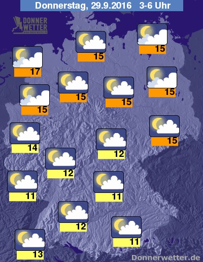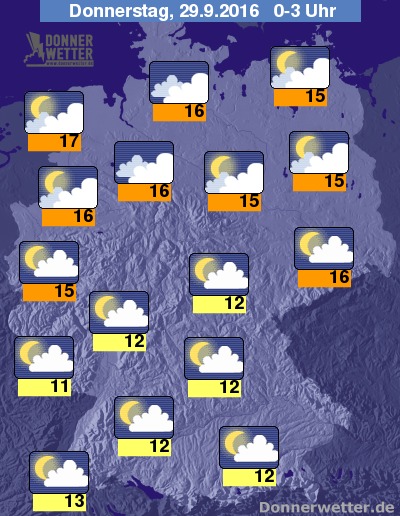 Die Temperaturen sinken in der Nacht auf Werte um 17 Grad C an der Nordseeküste und um 11 Grad C entlang der Donau.